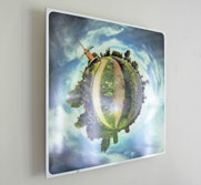 De Little planets worden standaard geleverd op een Dibond plaat van 60 x 60 cm. Dibond is een zeer licht en stijf plaatmateriaal. Het bestaat uit 2 aluminium lagen met daartussen een zwart gekleurde lichte polyethyleenkern. De aluminiumlagen zijn wit ovengelakt met Polyester. Dibond is vormvast, UV en vocht bestendig en geschikt voor lange termijn.